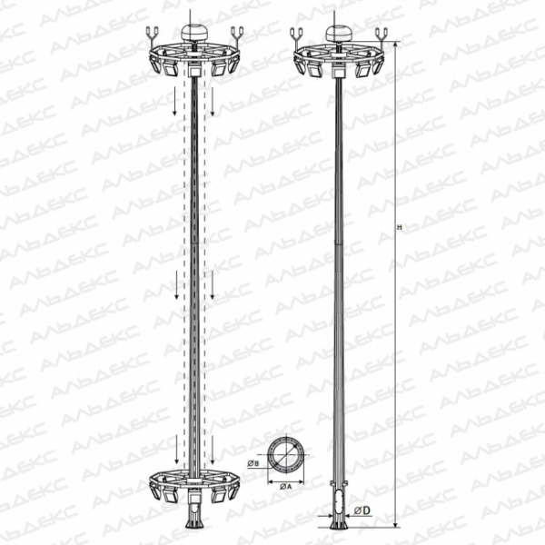 Высокомачтовые опоры освещения, предназначенные для монтажа большого количества светильников (до 12) на высоте, позволяющей увеличить их продуктивность и площадь охвата. Опоры ВМО-16-В исп. 5 заменяют собой сразу несколько стандартных опор освещения, что позволяет полностью окупить их увеличенную стоимость, связанную не только с большой металлоемкостью, но и со сложной организацией конструкций. При этом такие металлоконструкции отличаются оптимальным для своих габаритов весом, не создают излишней нагрузки на грунт, могут быть использованы для подземного подвода кабельной системы, что позволяет отказаться от протягивания дополнительных проводов. Системы используются на стадионах, на промышленных площадках и т.д. Их гармоничный дизайн и современное исполнение, а также возможность обслуживания без привлечения габаритной спецтехники, которой часто требуется специальный подъезд, позволяют использовать их при обустройстве жилых комплексов.